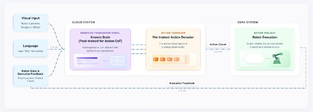 输入端整合机器人摄像头视觉数据、用户文本指令与本体状态反馈,以1-5Hz的频率同步输入云端KnowinBrain具身基座。