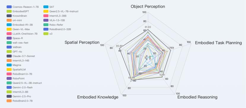 在Embodied Knowledge(具身知识)这一单项上,KnowinBrain稍落后Gemini-2.5-pro,位列第二。