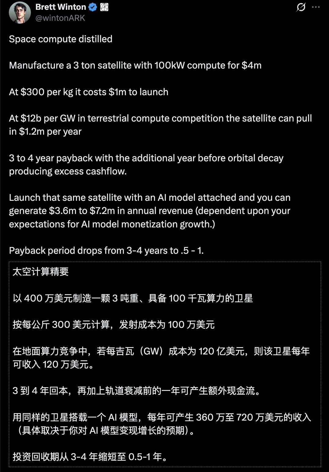 简单说:造一颗3吨、100kW算力的卫星,成本低,回报高,最差也是下一个云巨头(30%利润率,市场几万亿美元)。