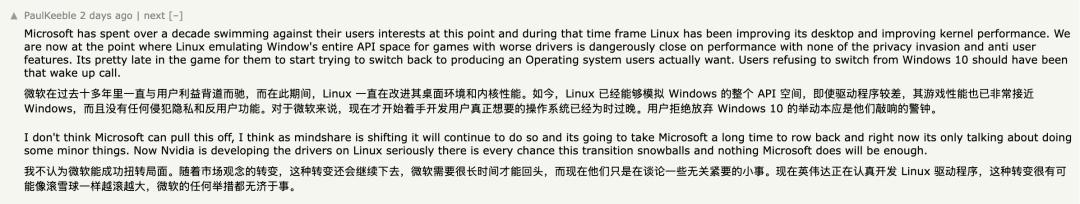 我不认为微软能做到这一点。随着用户认知的转变,这种趋势只会继续下去,而微软要扭转这一局面需要很长时间。目前他们只是在讨论一些相对细微的改进。再加上现在英伟达也开始认真为 Linux 开发驱动,这种转变完全有可能形成滚雪球效应,而微软所做的一切可能都不足以改变这一趋势。