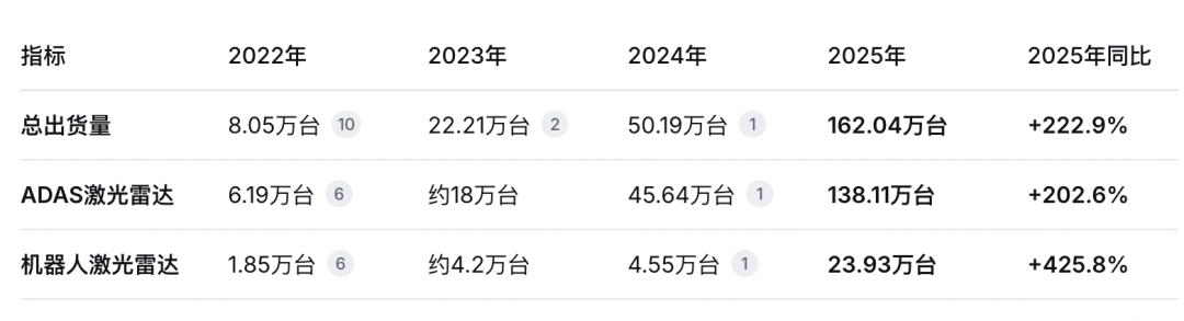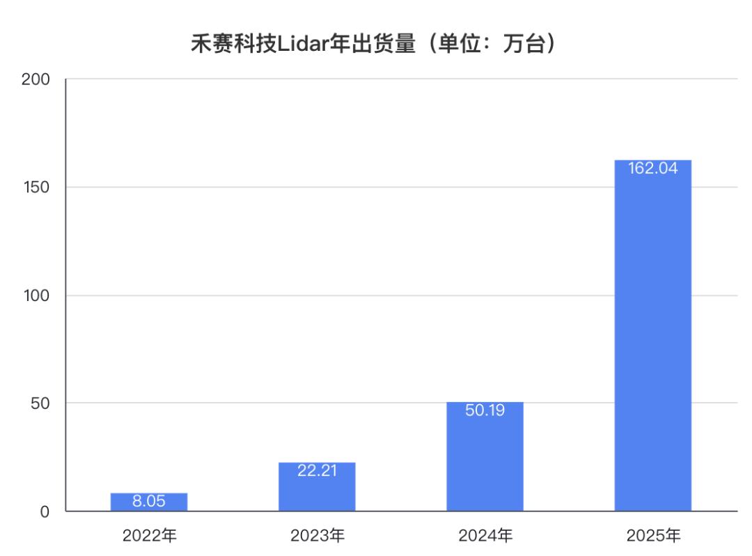 2025年禾赛科技一共出货激光雷达162.04万台,同比去年增长222.9%。