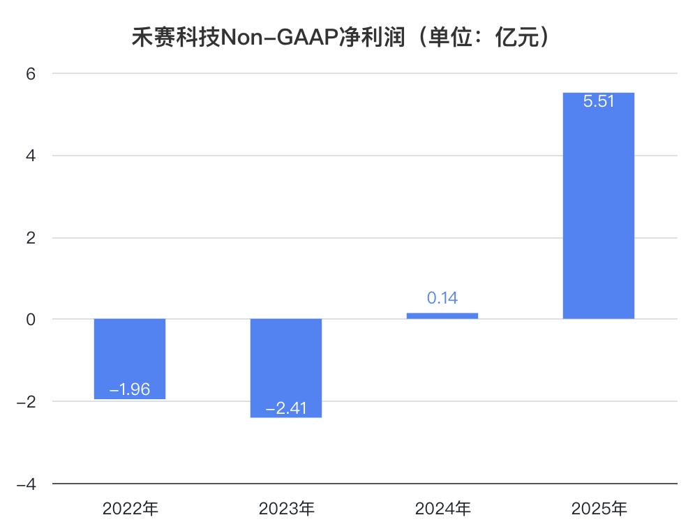 即使以非GAAP计算,禾赛2025年也达成了5.51亿元净利润,涨幅高达3922%!