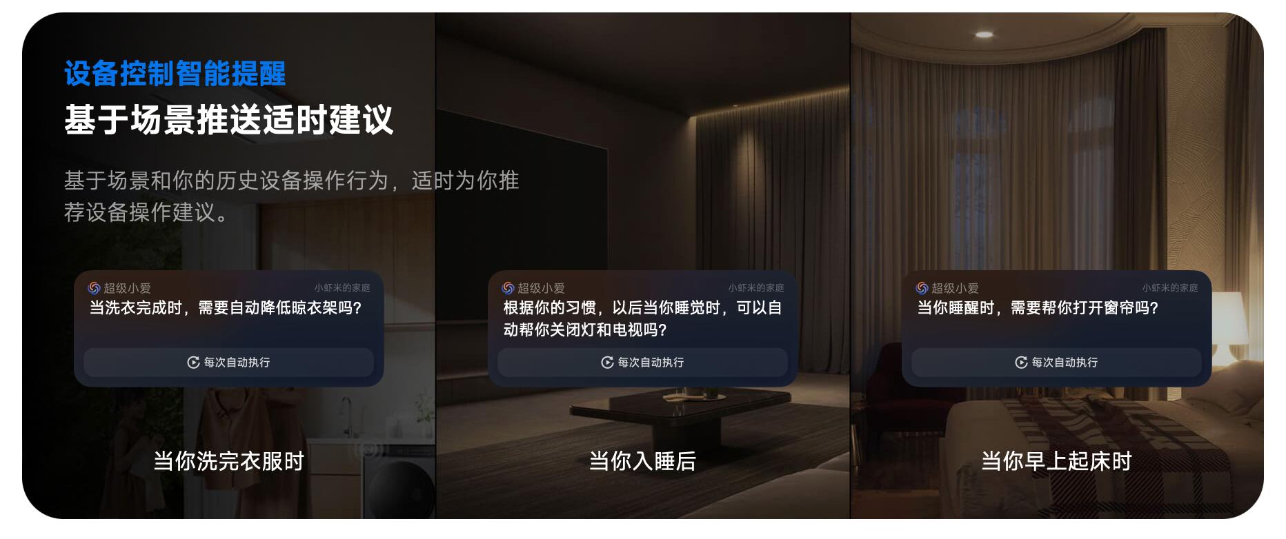 比如,用户对它说:「准备看电影了,弄得有氛围一点。」超级小爱会调用大模型分析「看电影的氛围」背后的具体需求是什么,然后自动执行一系列复杂操作:降下投影幕布、关闭主灯、开启电视背景RGB氛围灯、将音响切换至影院模式。