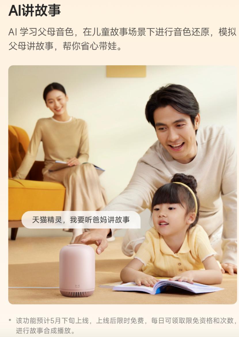 比如说,天猫精灵的讲故事功能将迎来一波重磅升级,它不仅能根据用户需求去发出声音,还能通过AI技术学习父母的声音,让孩子得到更多的情绪价值。