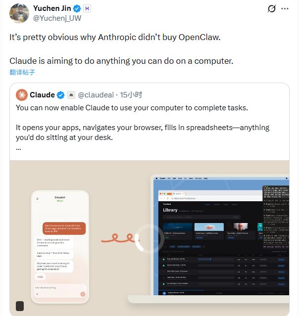 这种“集思广益”的打法,让Anthropic既能享受商业软件的稳定,又能吸纳开源社区的创新养分。正如Hyperbolic联合创始人金宇晨所言,Anthropic没去收购OpenClaw 的原因其实很简单,因为它的目标远不止于一个工具,而是要实现“人类在电脑上能做的一切”。