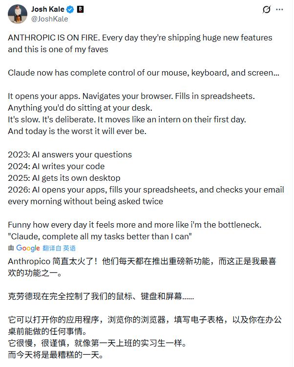 这种控制权也伴随着严格的安全防线。Anthropic为其设置了实时异常行为扫描以防范提示注入攻击,并在每步关键操作前征求用户许可。官方坦言,现阶段的Claude操作电脑时像个“第一天上班的实习生”,动作慢且略显谨慎,面对复杂UI仍可能犯错。但正如一位X用户所描述的:“它正在浏览你的浏览器,填写你的电子表格,做着你在办公桌前能做的一切。”这名“实习生”的转正速度,恐怕会超出所有人的想象。
