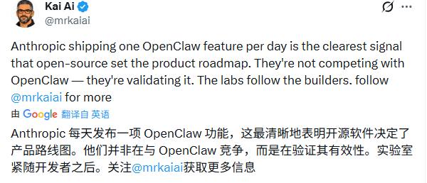 这揭示了当下AI赛道一个高效而残酷的生存法则:开源项目负责在无人区排雷,商业公司则负责将验证过的路径迅速产品化。正如社交媒体上的热议,“Anthropic几乎每天都在搬运OpenClaw的功能,开源软件正在定义大厂的产品路线图。”