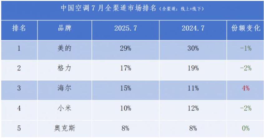与此同时,竞争对手也在步步紧逼。奥维云网数据显示,在2025年7月中国空调全渠道市场份额市场排名中,美的以29%的市场份额继续领跑,保持其自2024年首次超越格力成为 “一哥”后的领先优势;格力位列第二,份额从去年同期的19%下滑至 17%;海尔则以15%的份额占据第三位,较去年同期提升了4个百分点。