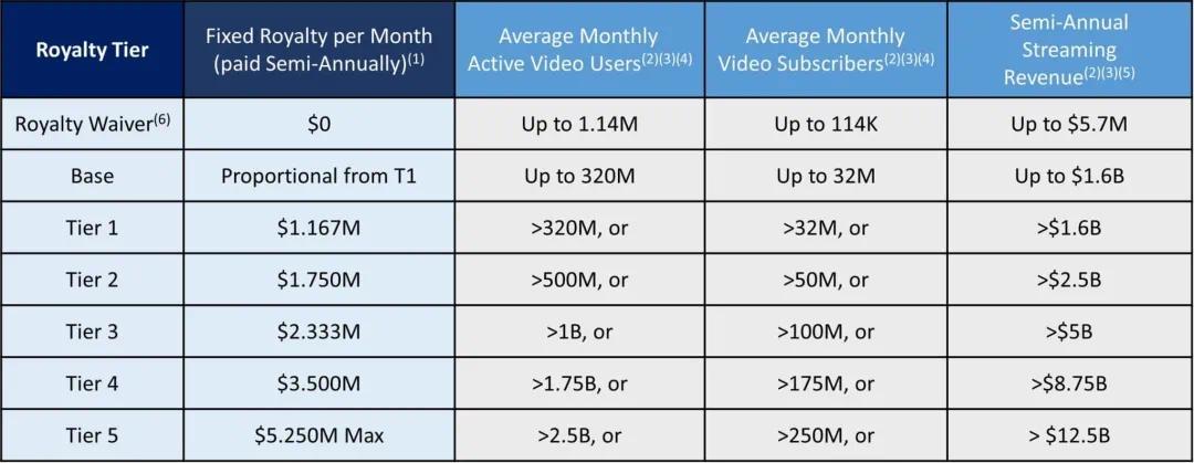 它的收费分为了七个梯度,主要根据流媒体平台每半年的月活用户、订阅用户和总营收来评定平台的等级,并收取对应的费用。