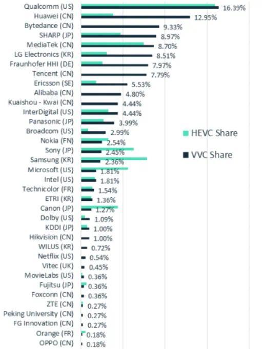 华为的 H.266 视频编码专利数量,占比 12.95%。