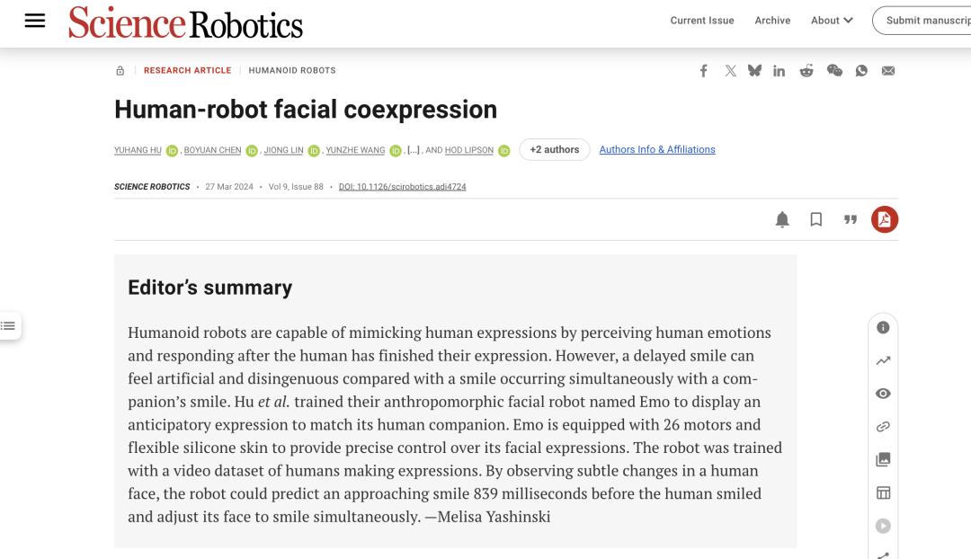 2024 年 3 月,胡宇航作为第一作者在 Science Robotics 发表了关于面部「共表达」的论文。