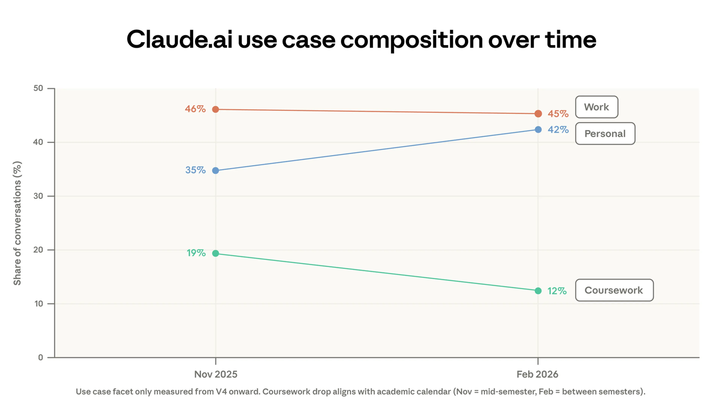 2025 年 11 月和 2026 年 2 月 Claude.ai 的工作、个人及课程使用情况。