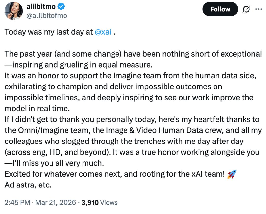 Monique,3月21日宣布离职。她在xAI工作了一年多,负责Imagine团队的人类数据工作,支持图像和视频人类数据团队。