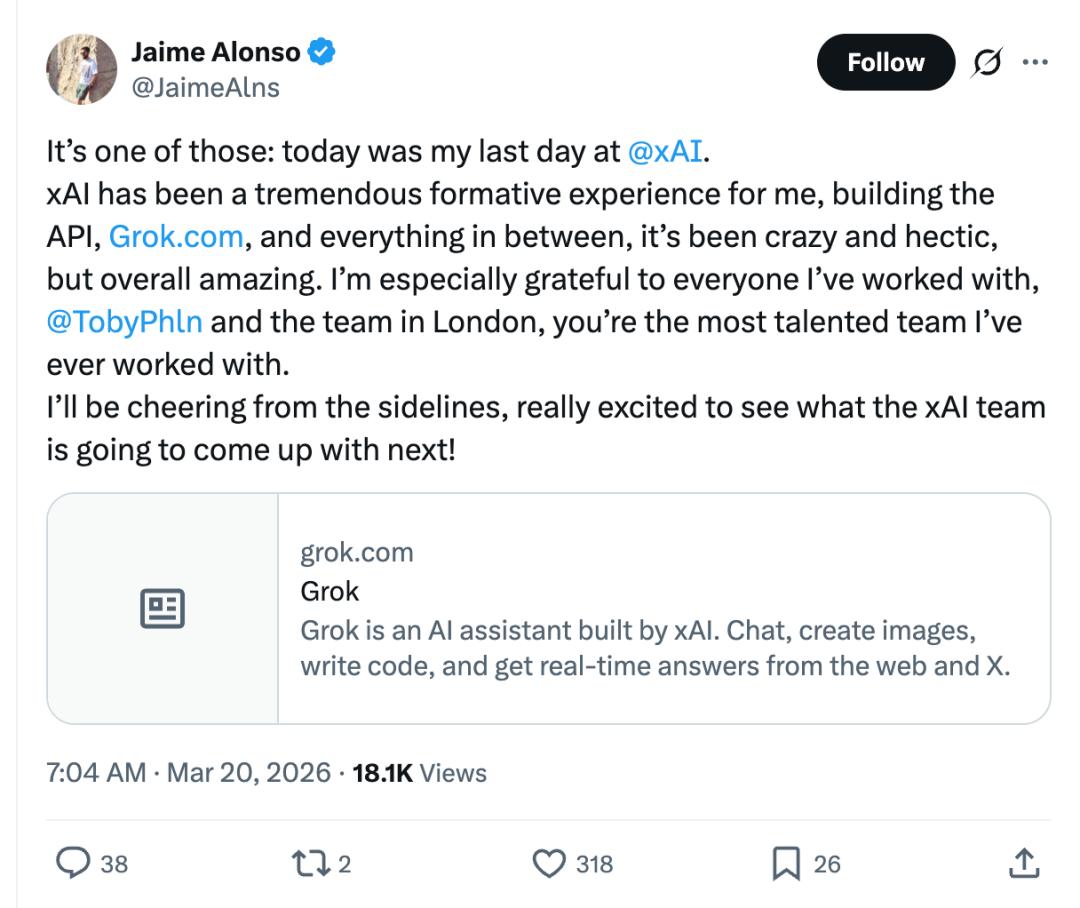 Jaime Alonso,3月20日宣布离职。他在xAI负责API和Grok.com的开发工作,与Toby Pohlen及伦敦团队合作;