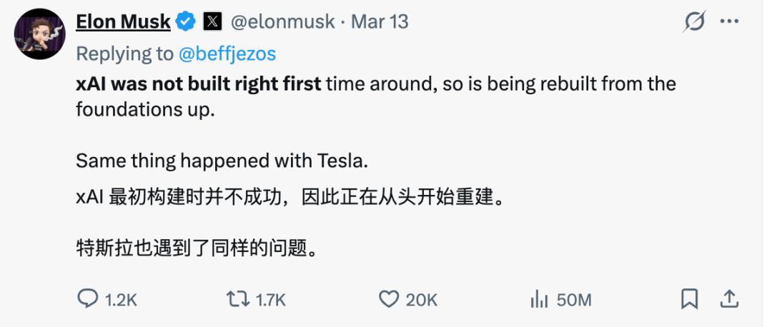 面对创始团队的大批流失,马斯克亲口承认,xAI一开始没建对,现在要从头再来。