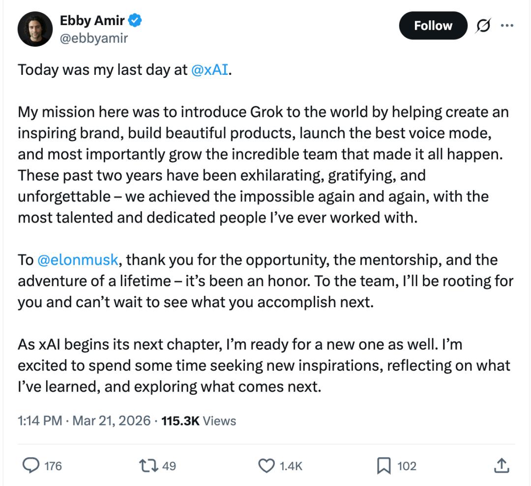 Ebby Amir,3月21日宣布离职,过去两年负责Grok的品牌推广、产品设计、语音模式开发和团队建设;