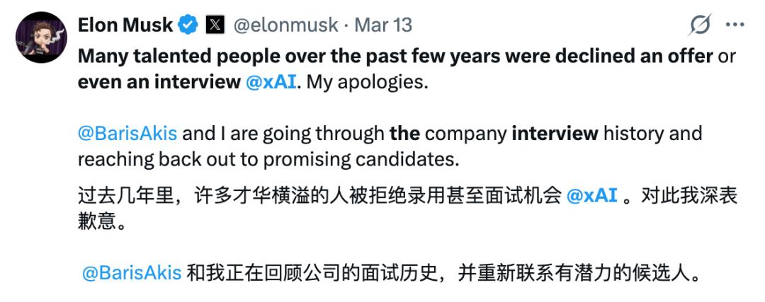 过去几年里,很多有才华的人都被拒绝了在@xAI的录用通知,甚至连面试机会都没有。对此我深表歉意。
