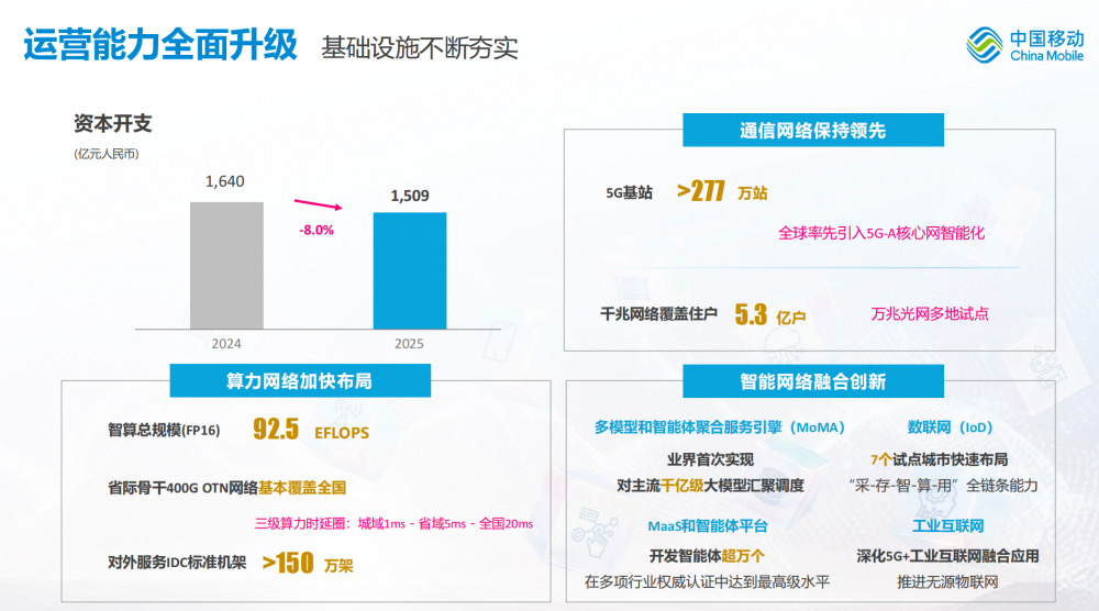 2026年中国移动资本开支计划为1,366亿元,同比下降9.5%,其中算力网络投资、智能网络投资分别增长62.4%、19.8%。三大网络中,算力网络和智能网络投资占比超37%。