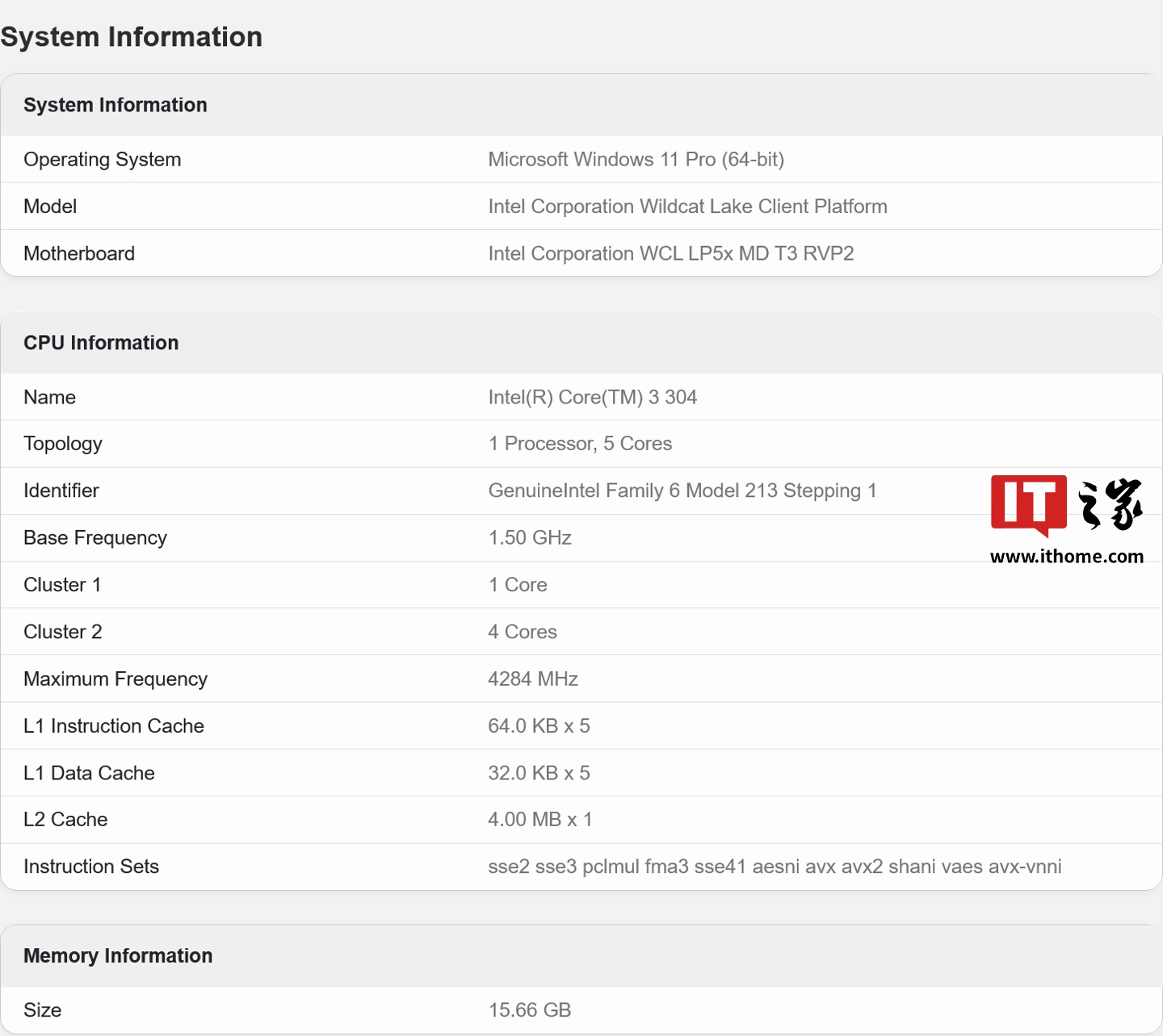 该处理器的名称此前已被外媒 VideoCardz 提到过,是 "Wildcat Lake" 家族的一员,定位相较早前曝光的酷睿 3 310、酷睿 5 320 更低,1+0+4 的 CPU 规格也小于后两者的 2+0+4。