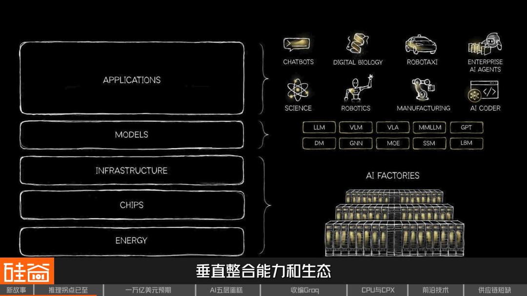 早在GTC开会的几天前,英伟达就放出了一篇名为“AI五层蛋糕”的文章来为大会造势,预示黄仁勋在今年大会上强调的是垂直整合能力和生态,而不是单芯片。