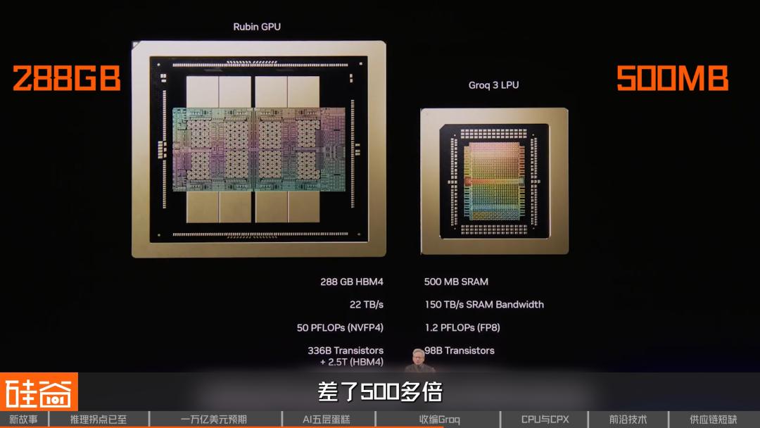 单颗Groq 3 LPU只有500MB SRAM,而Rubin GPU是288GB HBM4,差了500多倍,根本存不下万亿参数的模型。英伟达的解法是用Dynamo软件把推理过程拆成两半,Vera Rubin这边的GPU负责prefill和attention,而Groq负责之后decode和token生成。
