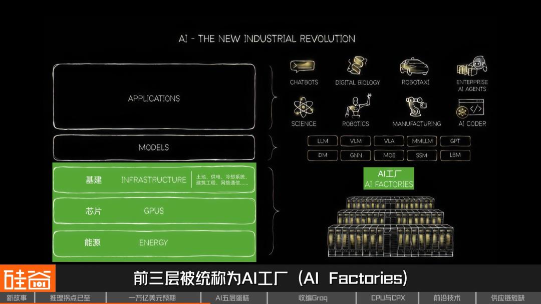 黄仁勋定义的AI五层蛋糕,从下到上,分别是能源层(这里是电力等基础供应),之后是芯片层(英伟达的核心业务:卡),再之上是基建层(包括云厂商及旗下的数据中心,再往细分就是土地、供电、冷却系统、建筑工程、网络通信等),前三层被统称为AI工厂(AI factories)。
