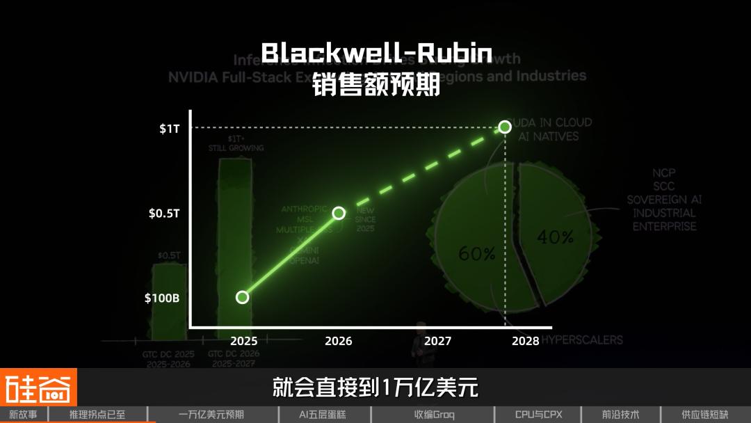 要注意,这个收入是不包括英伟达新发的CPU和基于Groq的LPU芯片等其他产品线的订单收入,而光是GPU架构的订单。他在媒体闭门会上专门特别澄清,原因是因为这样外界能直观的感受到英伟达的GPU上的业务增长。
