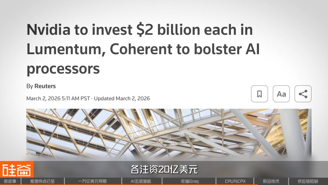 但英伟达在3月初分别向光子技术巨头Lumentum和Coherent各注资20亿美元,并锁定数十亿美元采购承诺及未来产能权益。这两家公司都是CPO的核心供应链,业内人士认为,黄仁勋这是在准备为下一代“吉瓦级AI工厂”去铺垫光互联的底座。