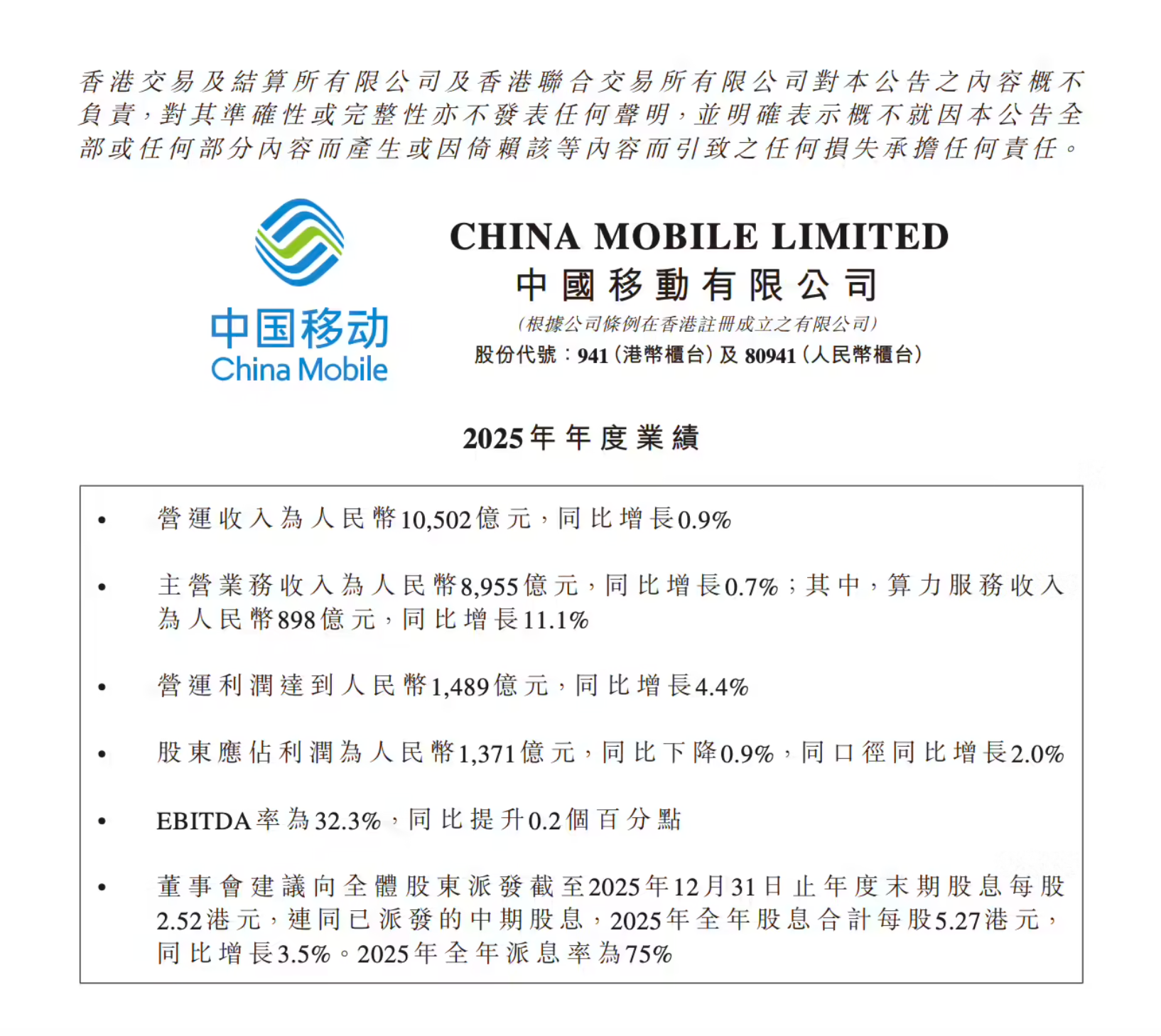 2025年公司营运利润达到人民币1,489亿元,同比增长4.4%。股东应占利润为人民币1,371亿元,同比下降0.9%,同口径同比增长 2.0%。