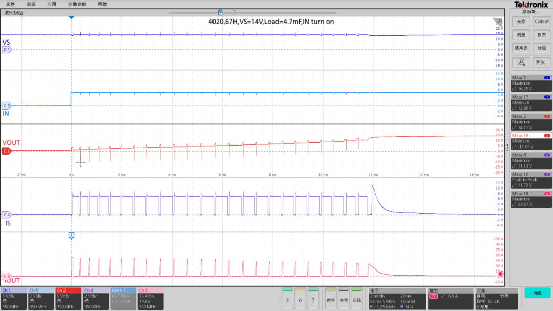 TPW4020DQ特别的故障Retry和Latch保护机制,实现智能功率锁止,使其能够支持更大电容负载的应用,图4所示为TPW4020DQ通过内部限流与温度保护控制的多次Retry过程,实现了输出带4.7mF电容的正常上电。而同样条件下,国外竞品带4.7mF电容的上电波形如图5所示。