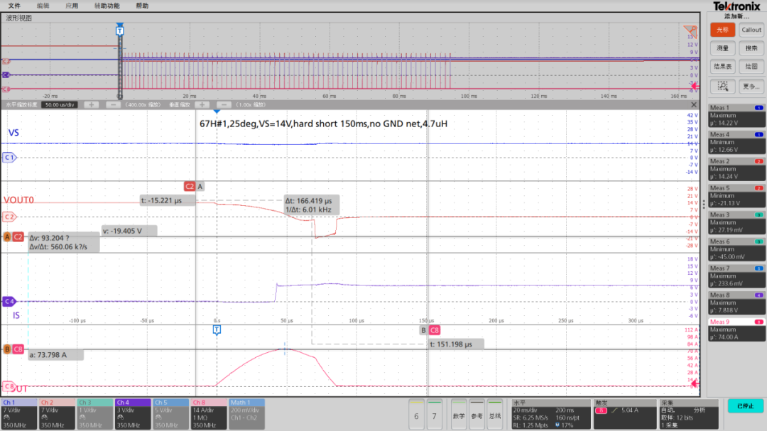 在复杂的工作环境中,一些故障更是对高边开关本身提出更加严苛的要求。图3以带4.7uH电感hard short短路(AEC-Q100-012)故障为例,触发限流保护过程开关电流峰值高达73A,随后触发温度梯度保护机制(关闭功率开关),电感续流使功率开关VDS电压达到钳位电压(接近40V),钳位过程最大电流高打50A,极高的瞬间功率给高边开关的可靠性带来严峻的挑战。