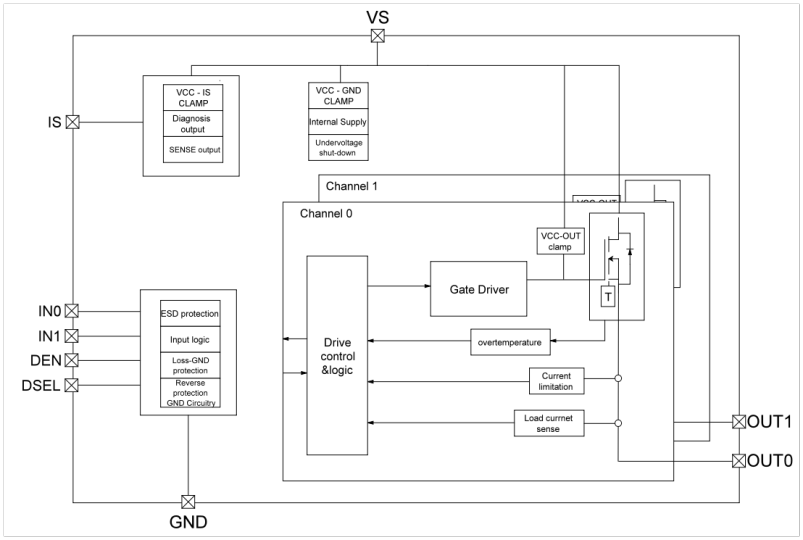极端工作环境下的高系统鲁棒性车载环境存在强电磁干扰、电池电压大幅波动(比如启动时电压骤降、抛负载时电压骤升)、宽温域变化等恶劣条件。VS-GND和VS-IS电压钳位能够使芯片适应电压骤变,避免引起系统故障。VDS电压钳位和限流机制、绝对温度和温度梯度保护机制能够有效避免长距离布线在断电/短路时因走线电感续流或过流而引起系统故障。