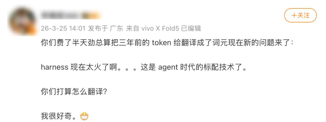 微博上关于 Harness 怎么翻译的讨论也很多,Token 可以翻译成智元的话,那 Harness 就叫智驭吧……也有人觉得和 MCP 现在无人问津的状态一样,Harness 这个概念只是现在热,过一段时间又会有新的词被造出来、被流行。