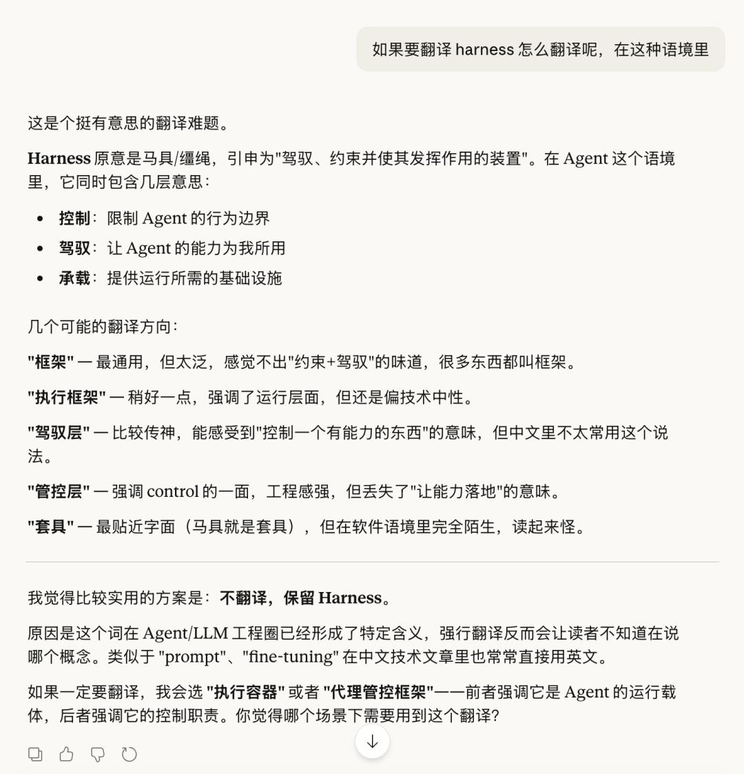 所以最后它说比较实用的方案是,不翻译,就用 Harness。