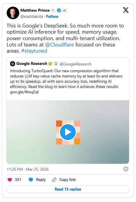 Cloudflare首席执行官Matthew Prince等人则将其称为谷歌的“DeepSeek时刻”,认为其有望像DeepSeek一样,通过极高的效率收益大幅拉低AI的运行成本。