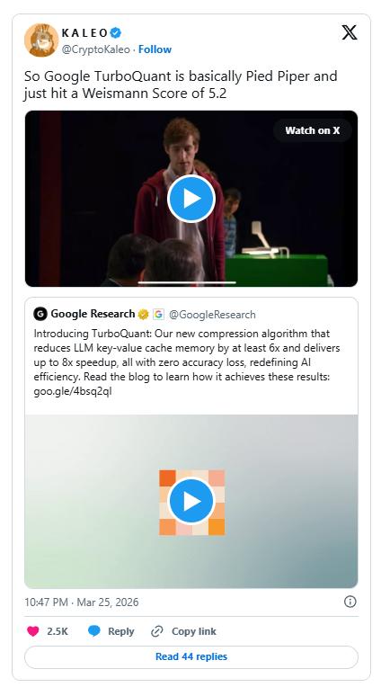 谷歌发布名为TurboQuant的内存压缩算法后,市场对存储硬件长期需求的担忧迅速蔓延,导致相关资产遭到抛售。