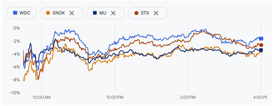 周三,受该技术可能大幅削减AI硬件需求预期的冲击,美股存储芯片板块盘中遭遇重挫。截至收盘,存储芯片与硬件供应链指数下跌2.08%,闪迪、美光科技等头部企业均显著收跌,凸显出市场对需求前景的防御性反应。