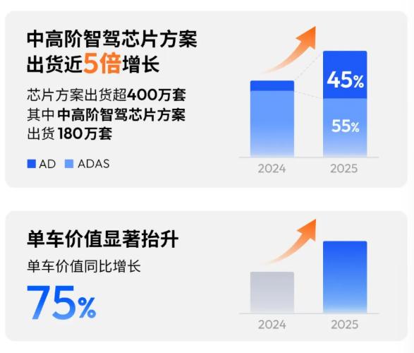 所以我们可以看到,地平线在去年是猛猛出货,总共卖了 400 万套,其中增长最猛的,就是中高阶智驾芯片,达到 180 万套,比前年多了 5 倍。
