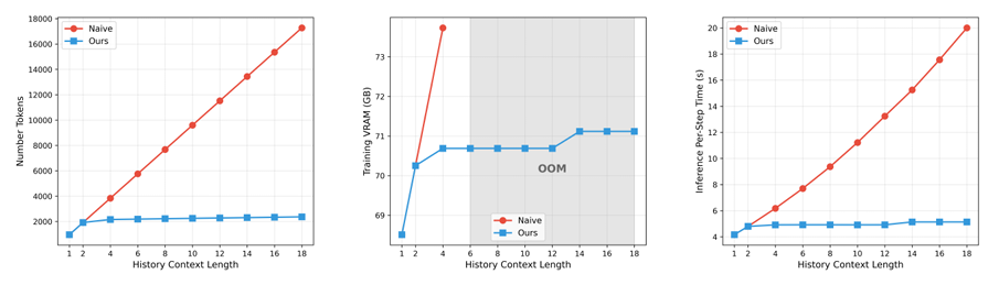 这个简单的思路,让Helios在回顾非常久远的历史画面时,消耗的token仍然能保持在一个极低的恒定水平,历史信息的显存占用直接压缩到了原先的八分之一,彻底打消了单卡运行“爆显存”的无解难题。