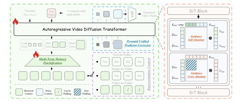 但Helios采用的是“纯教师强制(Pure Teacher Forcing)”模式,让模型无需模拟未来的视频,而是直接把海量的真实连续视频切片作为唯一的参考标准喂给模型。