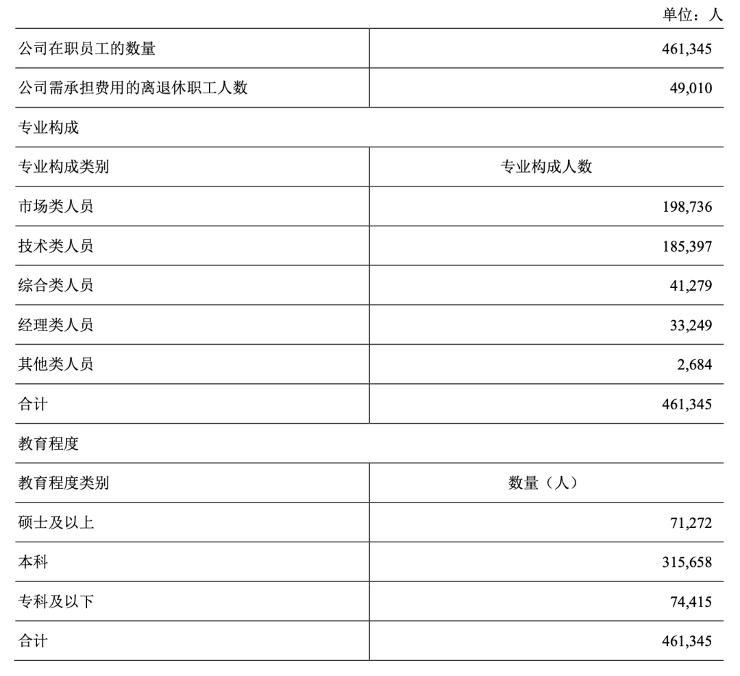 报告显示,中国移动2025年在职员工数量为461345人,净增5940人。其中: