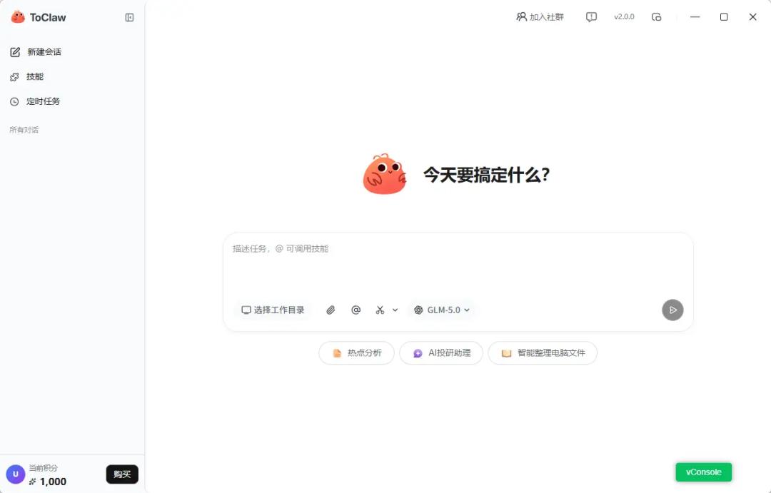 产品概况:ToClaw本质上是一个将OpenClaw和Skill打包好的操作台。