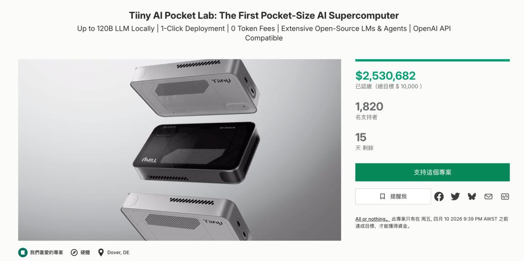 最典型的案例之一,是成立于2025年初的AI Infra公司Tiiny AI。2026年3月,他们的产品Tiiny AI Pocket Lab——一个封装大模型(最高支持120B(int4))、体积仅iPhone 17 Pro Max大小的盒子,在北美众筹平台Kickstarter上线5小时,销售额就突破了100万美元;截至目前,众筹金额已经高达250万美金。