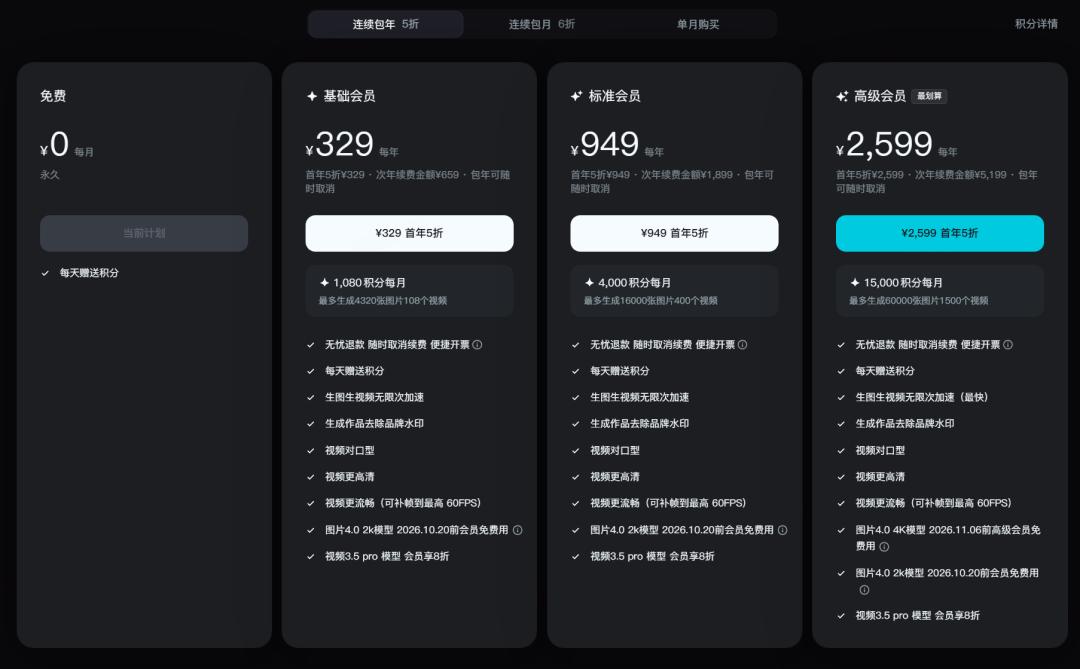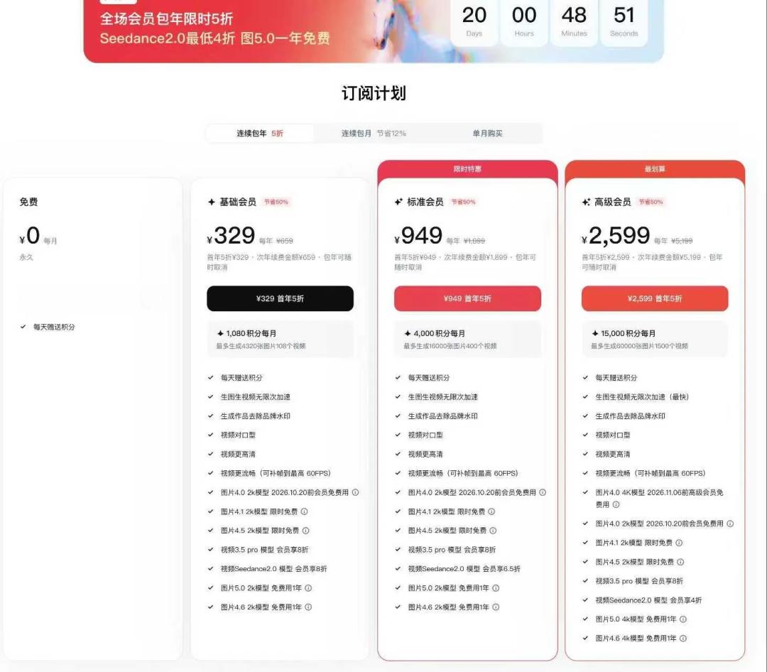 即梦Seedance2.0自2月初发布以来,就凭借着优秀的能力爆火。打开即梦AI的会员充值界面,付费会员分为三档。