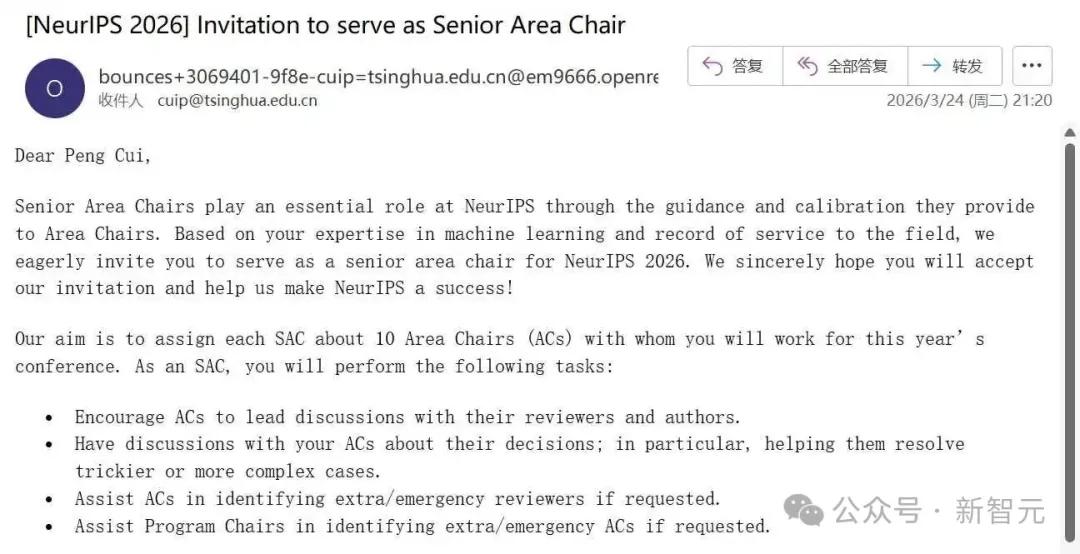 清华大学崔鹏教授直接拒绝了NeurIPS 2026的Senior Area Chair邀请,在回复中留下一句话: