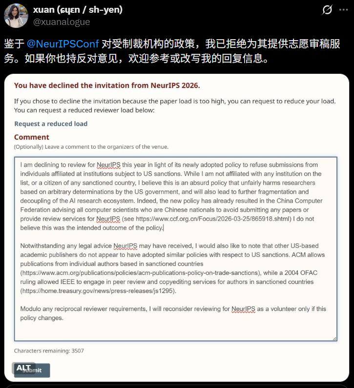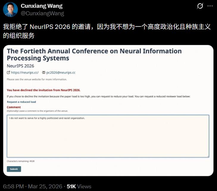 AI研究员王存祥在X上宣布拒绝担任审稿人,措辞毫不客气:「我不愿意为一个高度政治化和带有种族主义色彩的组织服务。」