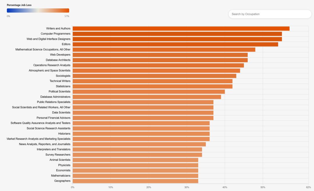 具体到职业,作家的岗位替代率高达57%,程序员和网页设计师双双达到55%。