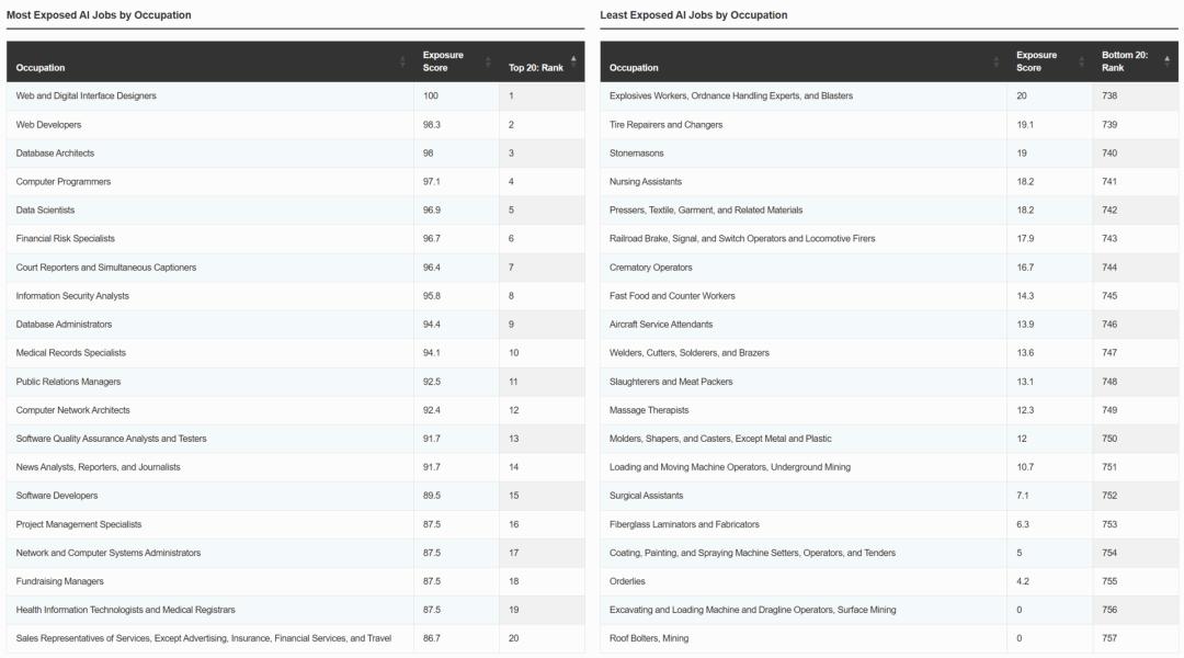 按AI岗位暴露程度的职业排名:受AI影响最大与最小的职业。(图片来源:Digital Planet)
