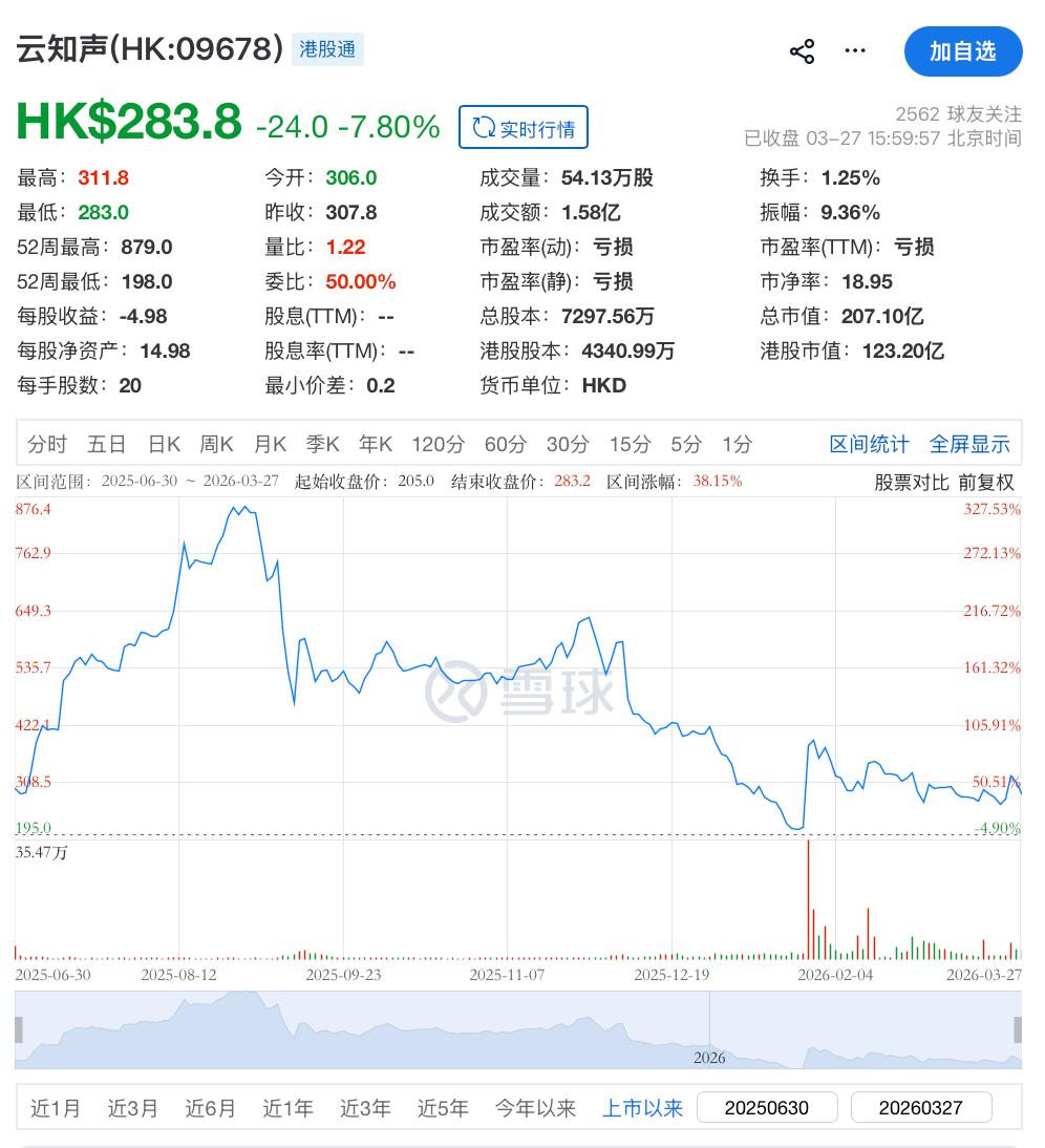 今日开盘,云知声微跌0.58%报306港元,盘中最低触及283港元。截至收盘,其股价跌幅扩大至7.99%报283.2港元,总市值206.67亿港元,已跌至上市首日开盘水平。