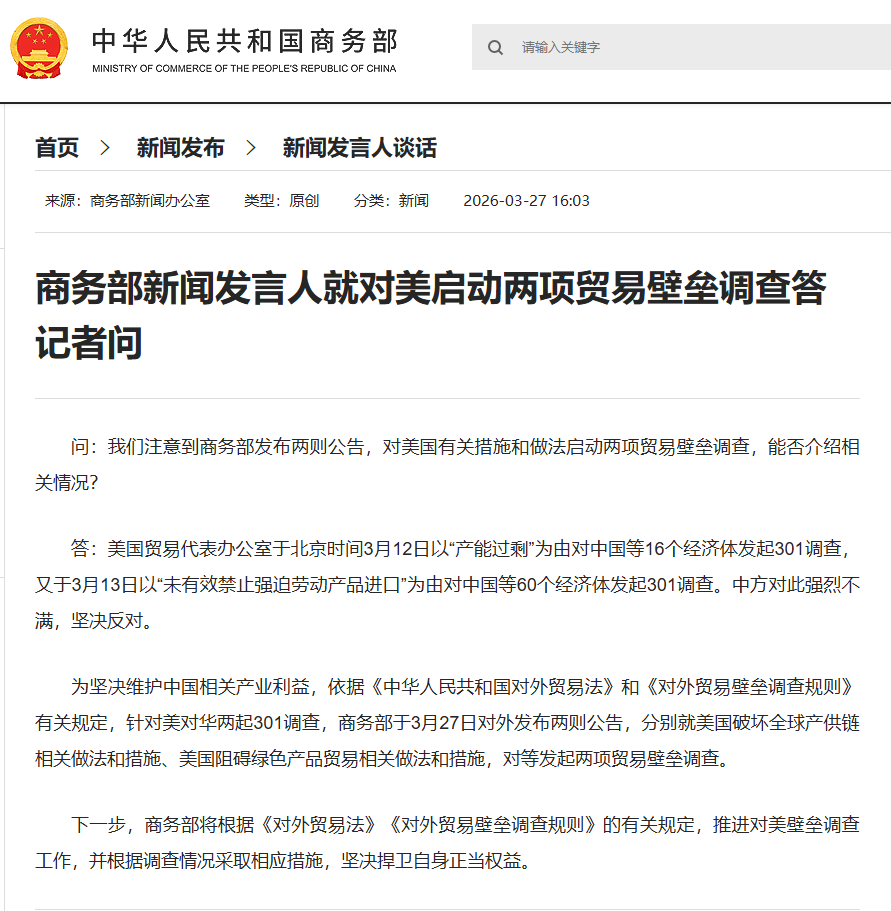中国商务部新闻发言人表示,美国贸易代表办公室于北京时间3月12日以“产能过剩”为由对中国等16个经济体发起301调查,又于3月13日以“未有效禁止强迫劳动产品进口”为由对中国等60个经济体发起301调查。中方对此强烈不满,坚决反对。为坚决维护中国相关产业利益,依据《中华人民共和国对外贸易法》和《对外贸易壁垒调查规则》有关规定,针对美对华两起301调查,商务部于3月27日对外发布两则公告,分别就美国破坏全球产供链相关做法和措施、美国阻碍绿色产品贸易相关做法和措施,对等发起两项贸易壁垒调查。下一步,商务部将根据《对外贸易法》《对外贸易壁垒调查规则》的有关规定,推进对美壁垒调查工作,并根据调查情况采取相应措施,坚决捍卫自身正当权益。